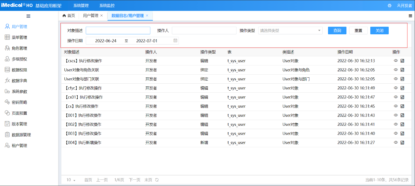 数据日志可以根据对象描述、操作人、操作类型、操作时间来查询。默认查询最近一周的数据。如下图所示: