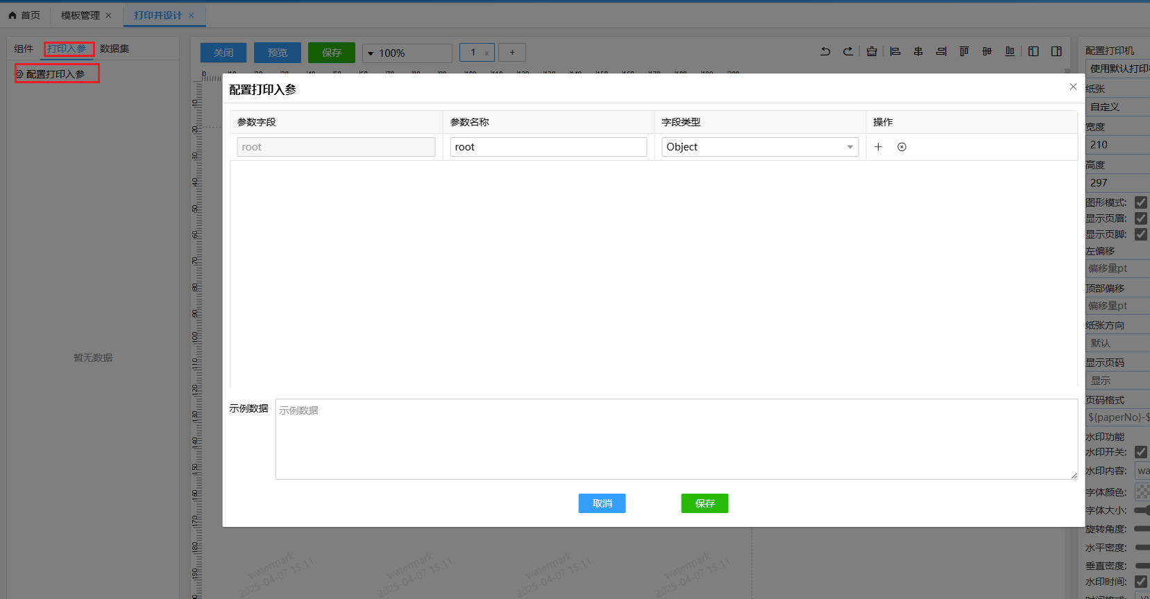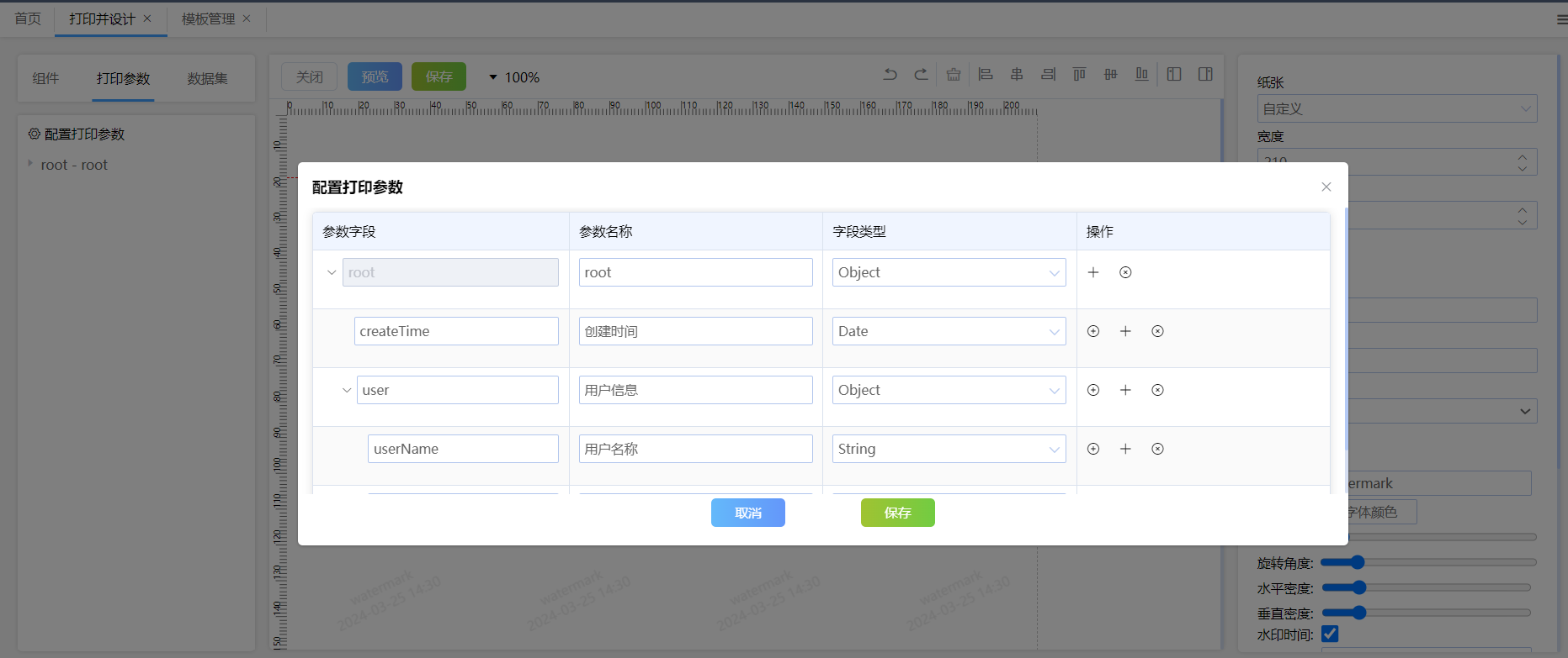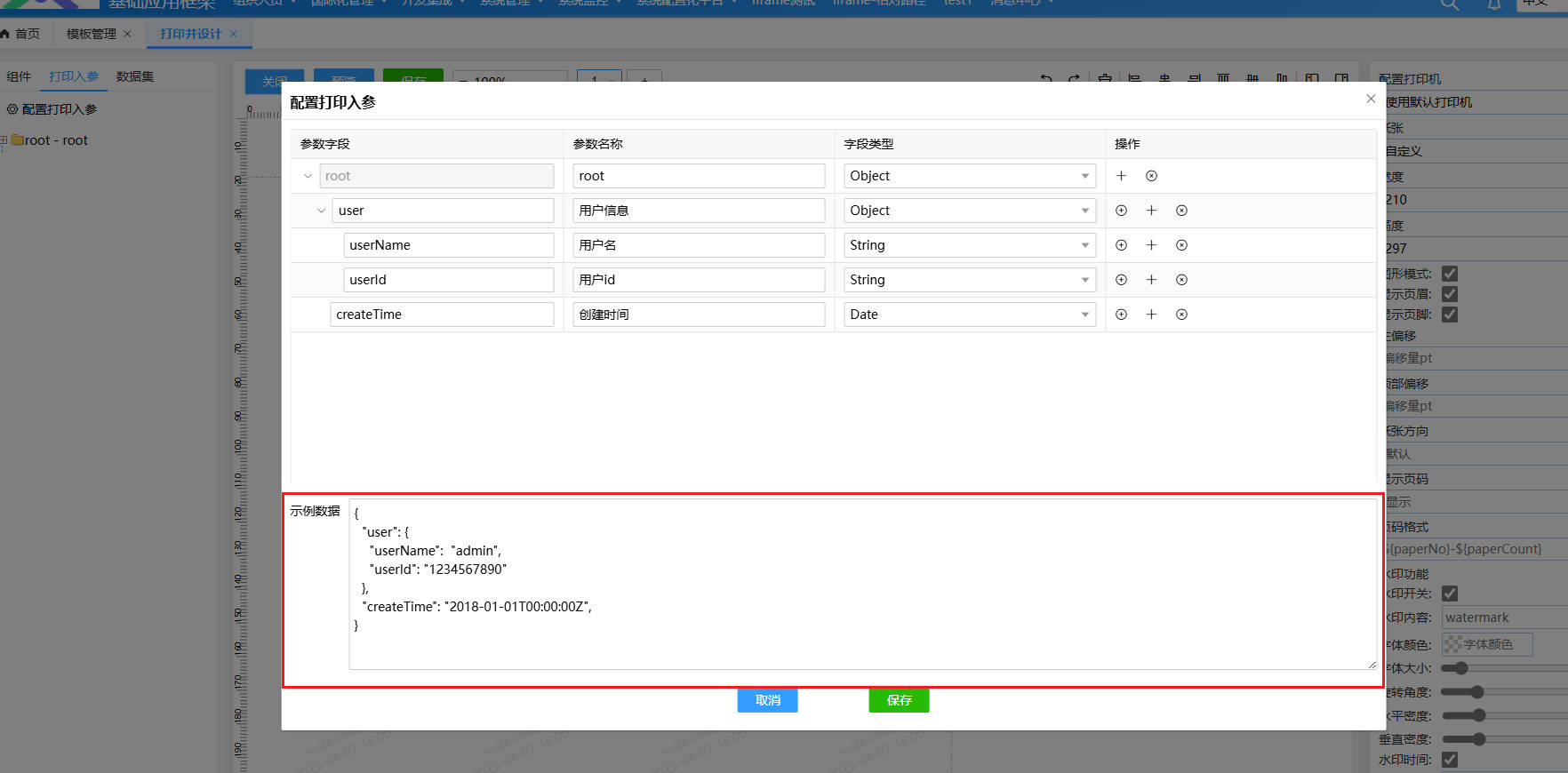 按照前端数据格式配置好打印参数。 注意:字段只有是Object和Array时可以创建子集。当Array子集为对象时,应按照Array->Object->对象属性这种层级配置。