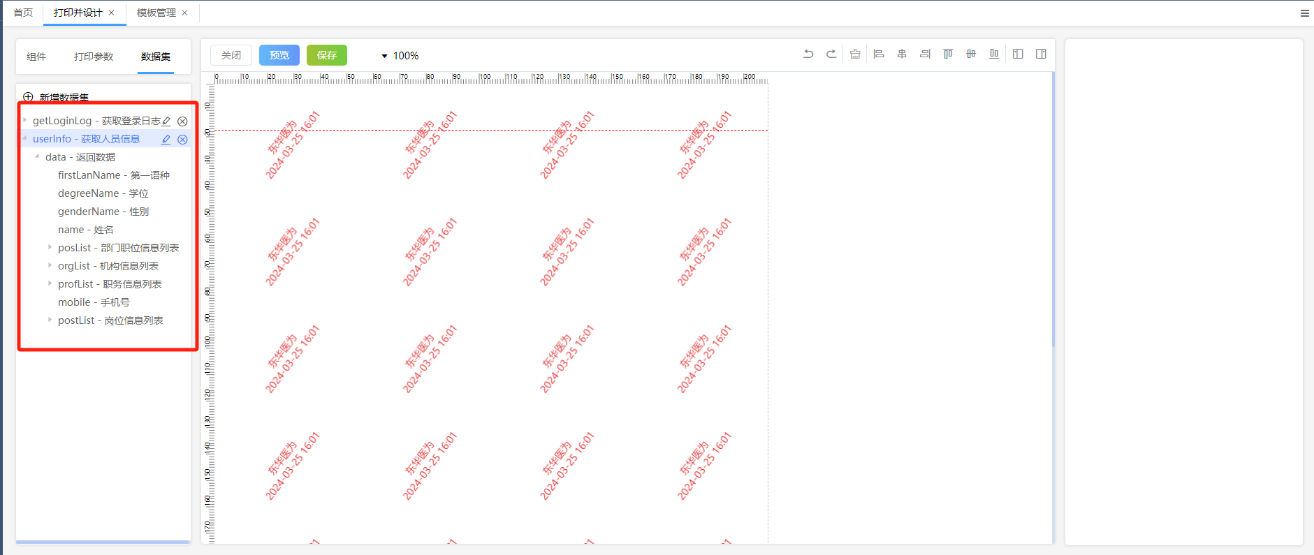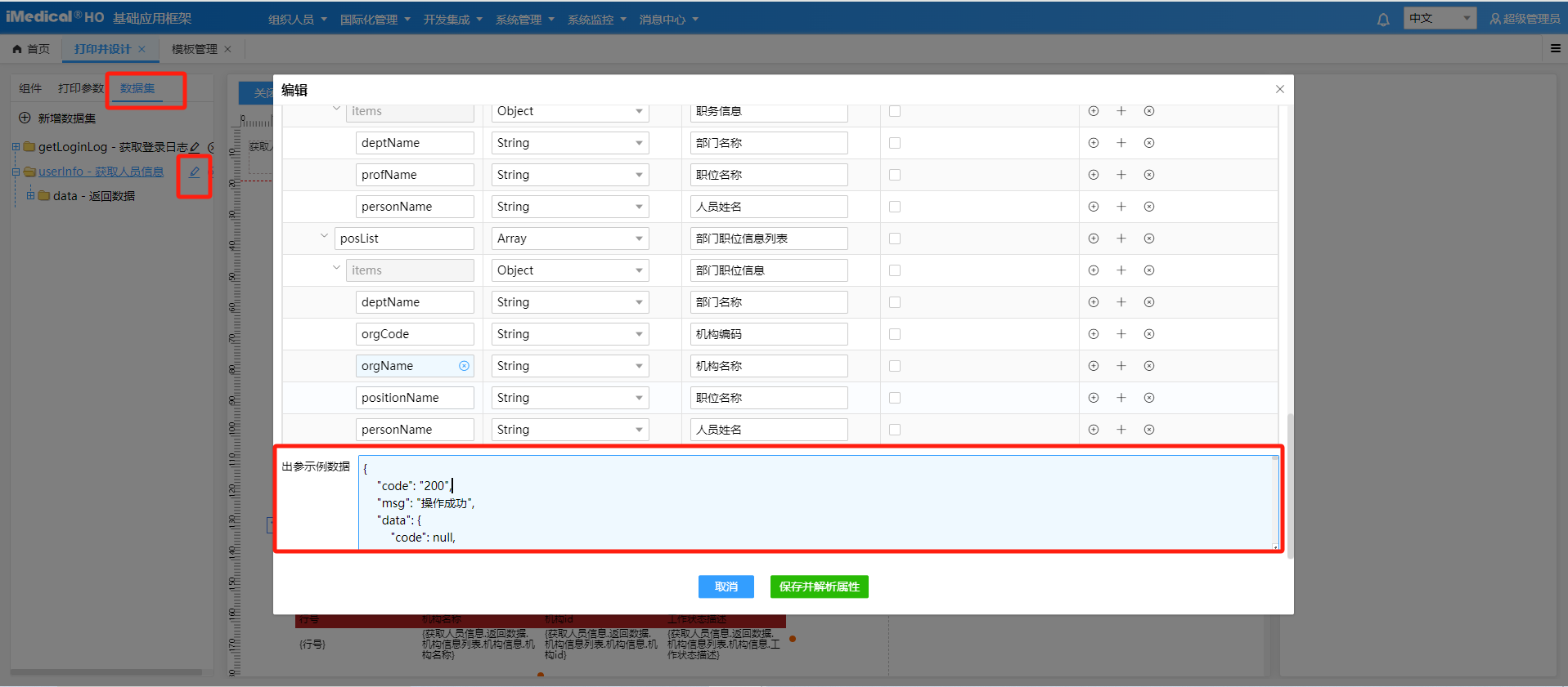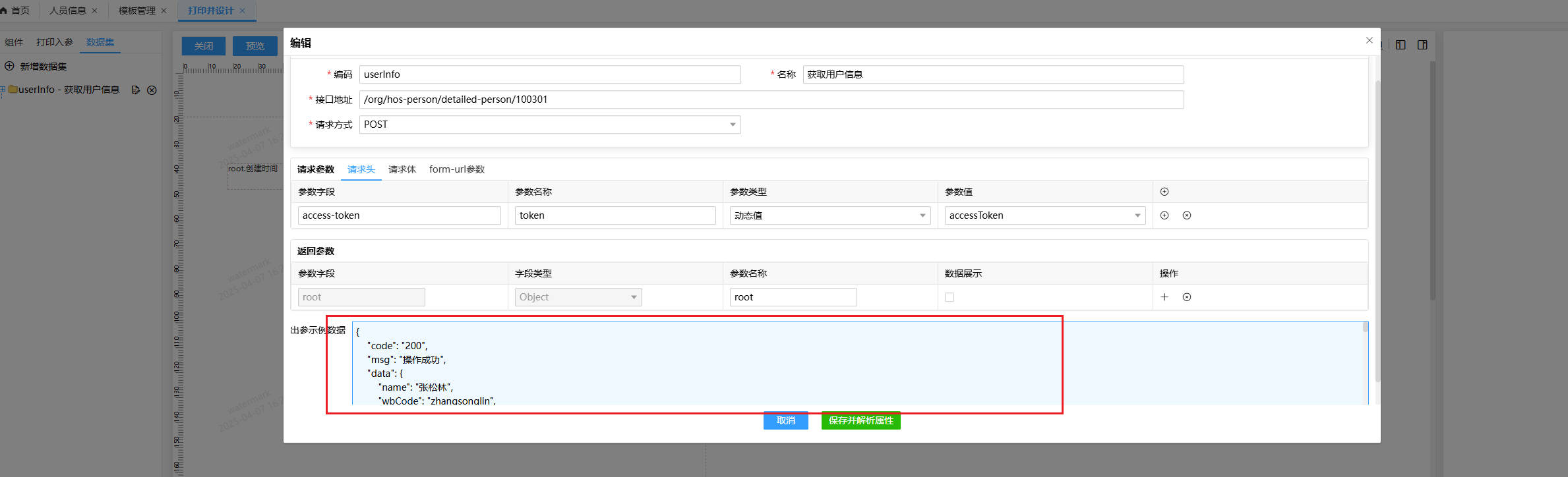 按照前端数据格式配置好打印参数。 注意:字段只有是Object和Array时可以创建子集。当Array子集为对象时,应按照Array->Object->对象属性这种层级配置。