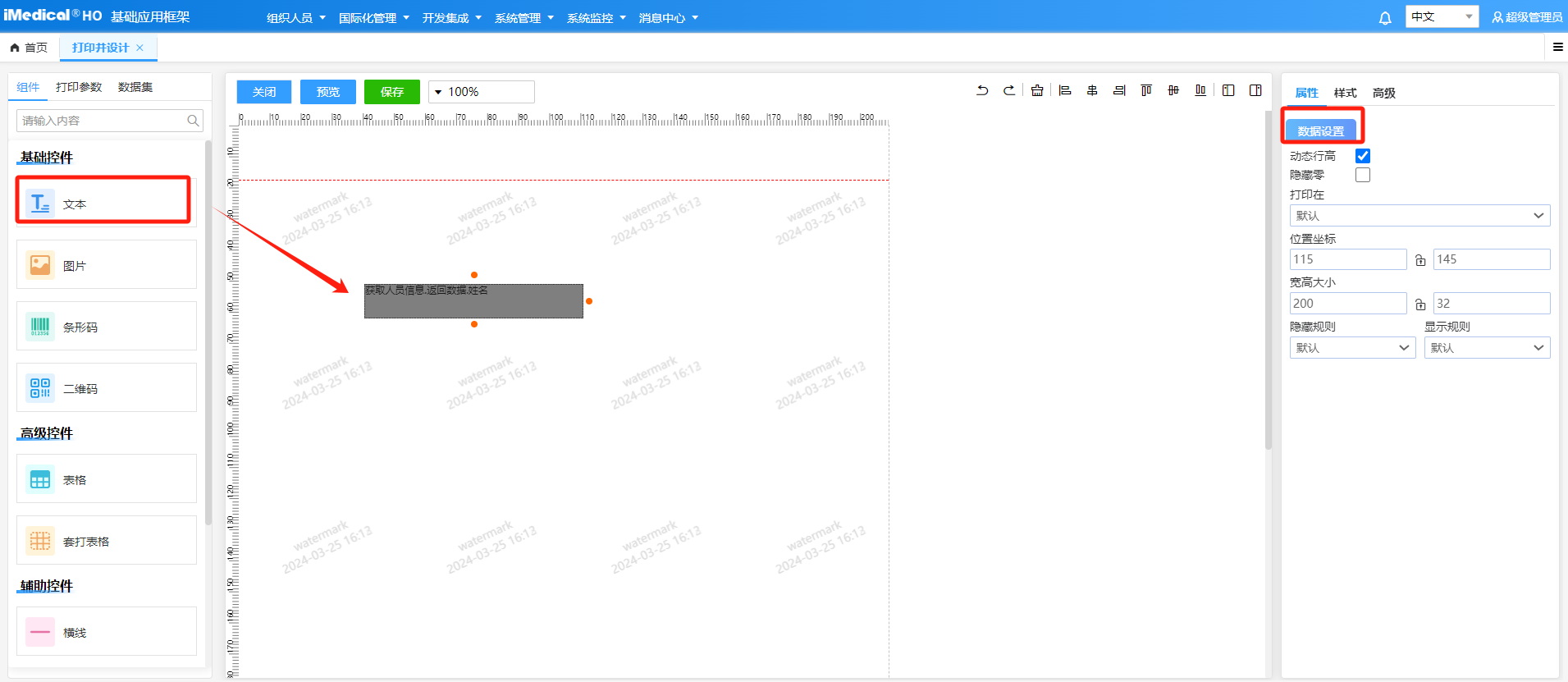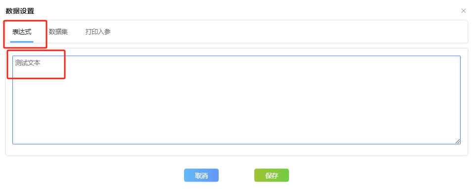 数据设弹窗中可以通过表达式、数据集以及打印入参三种方式定义文本组件的数据源,第一种表达式需要用户手动输入需要展示的静态内容,输入的内容即是打印中的内容。