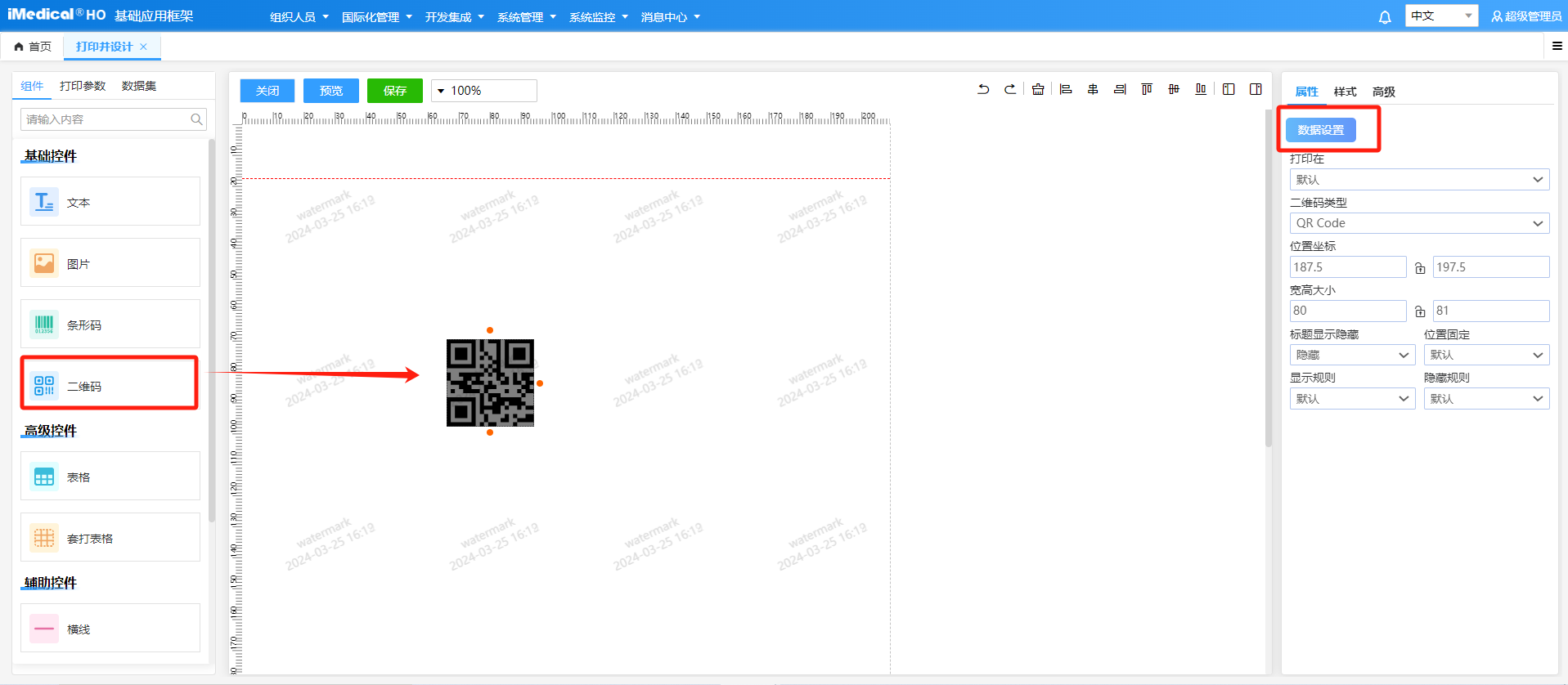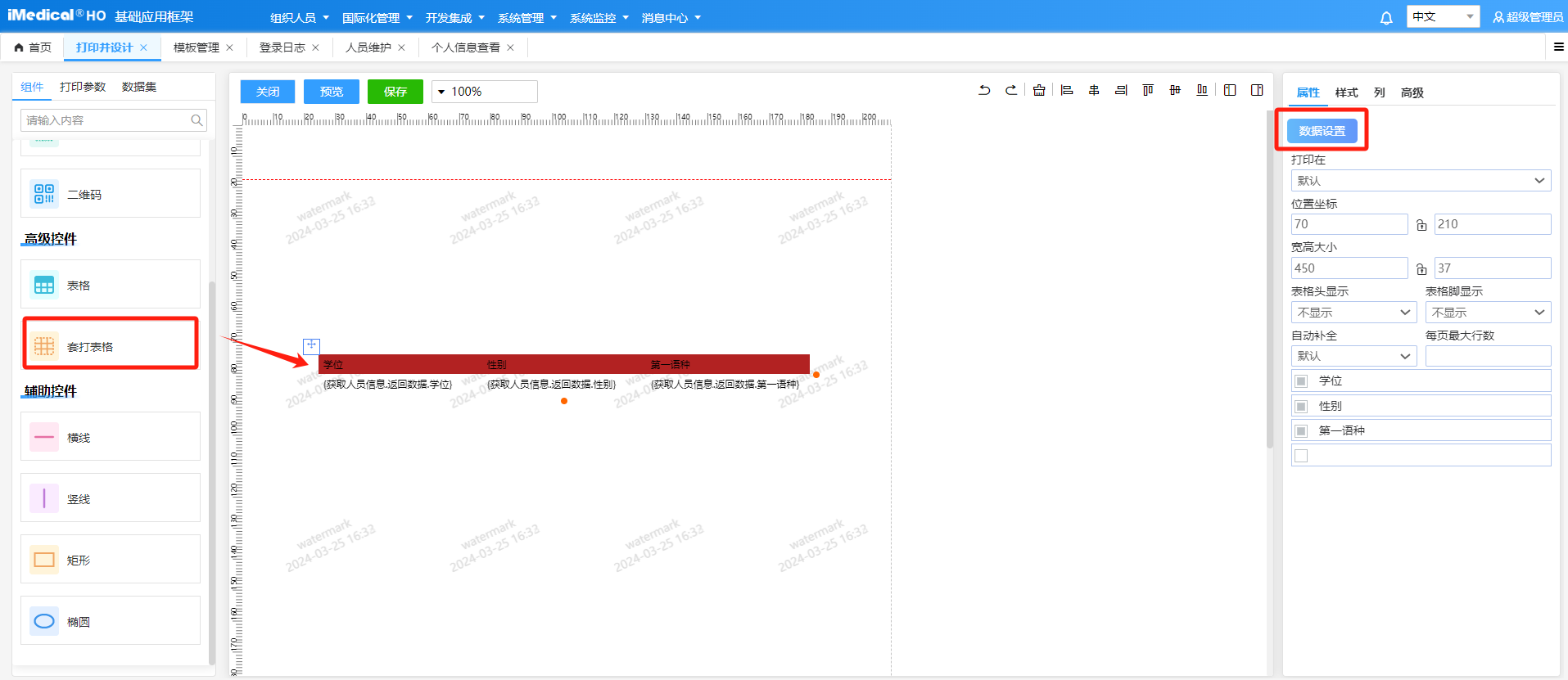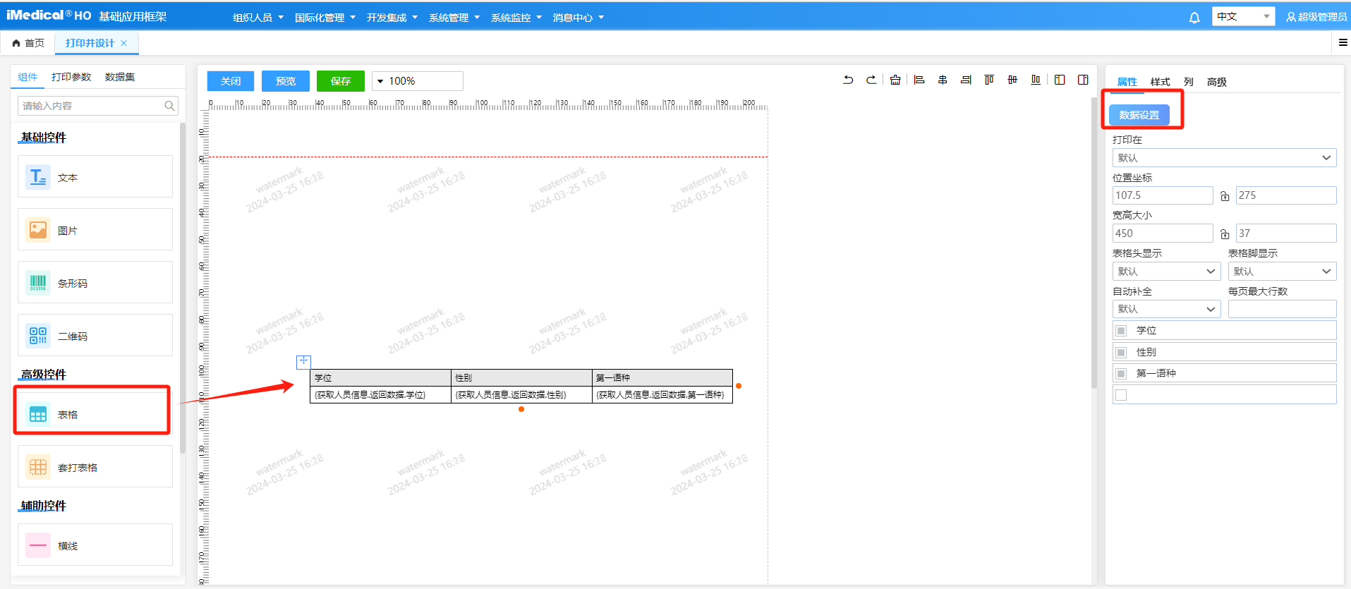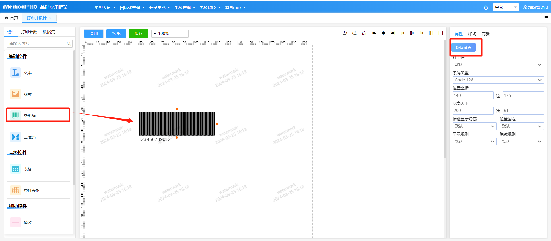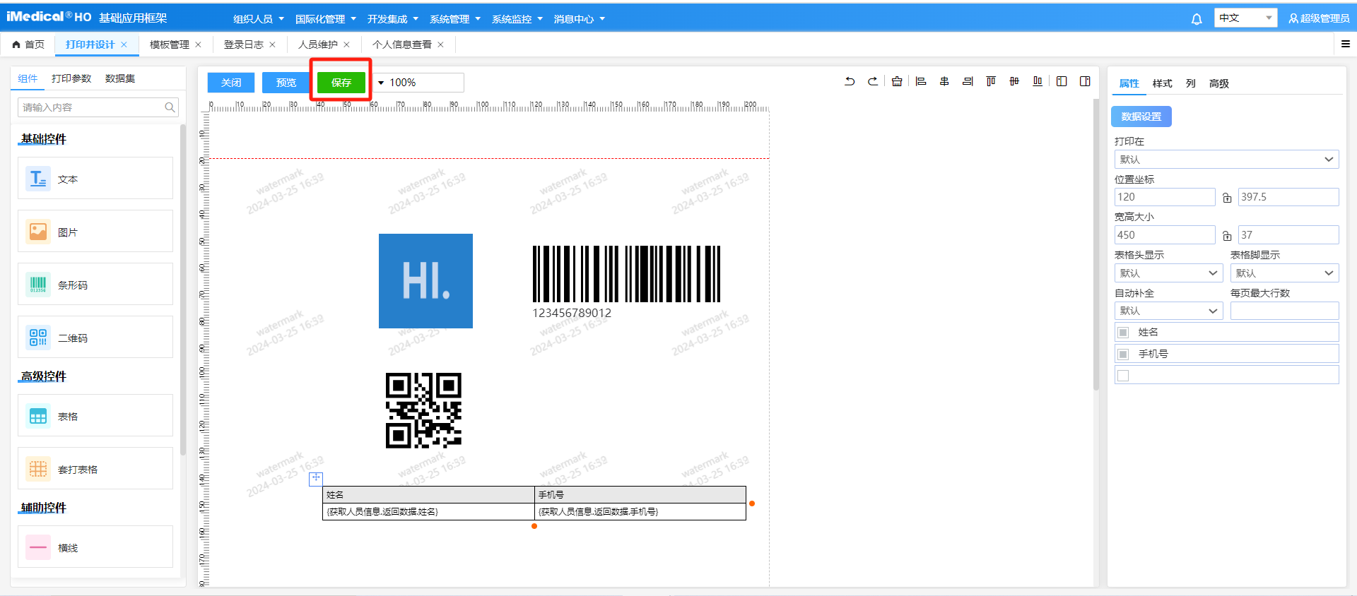 Lodop打印设计器支持文本、图片、条形码、二维码、表格、套打表格、辅助功能等组件。只需要将组件拖动至画布中,选择组件的数据设置、样式设置等配置 即可完成Lodop打印模板的设计。