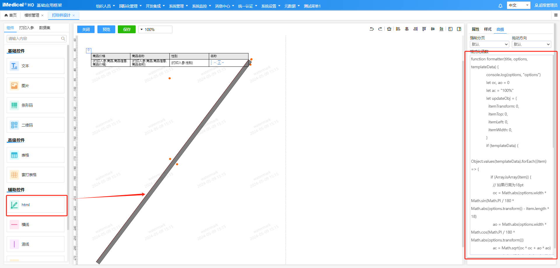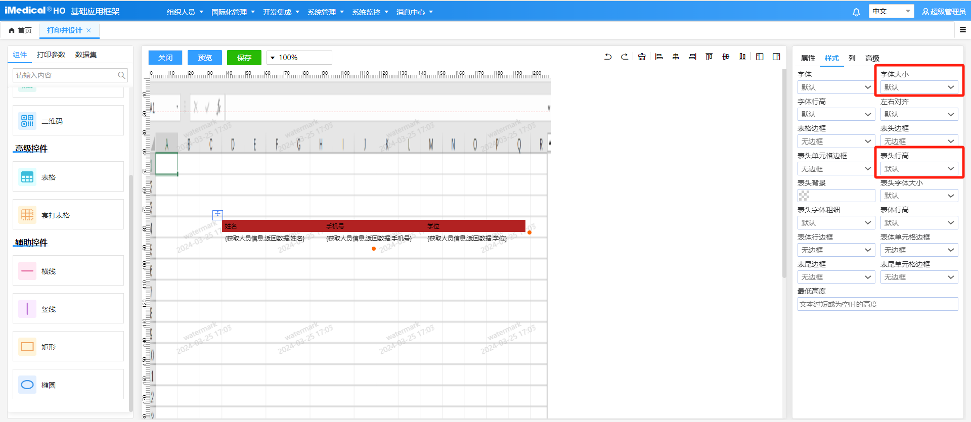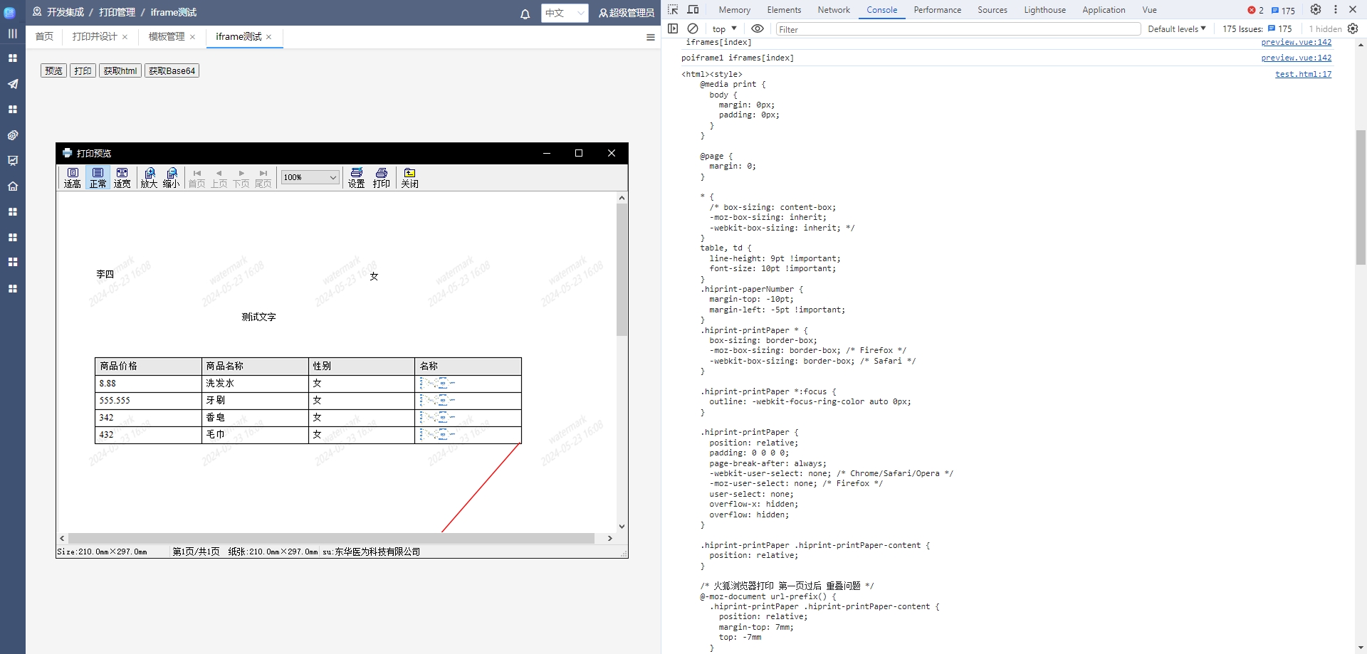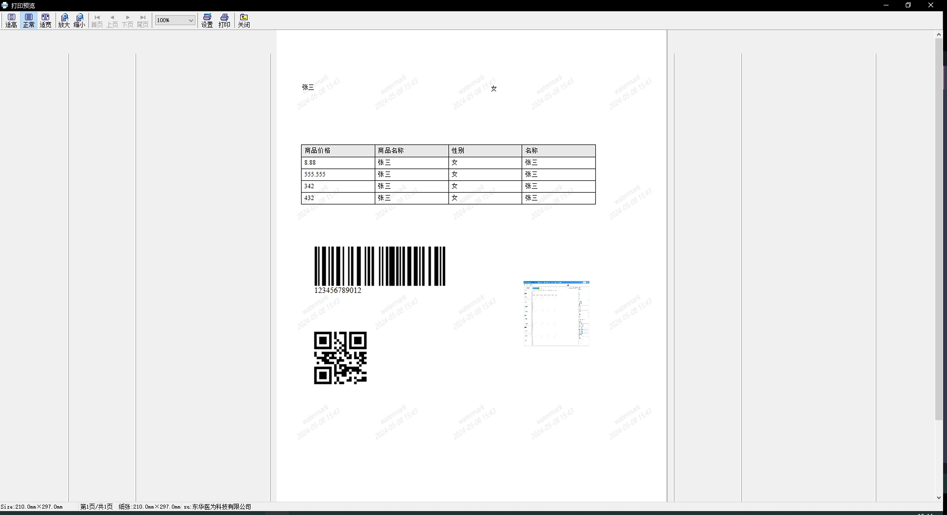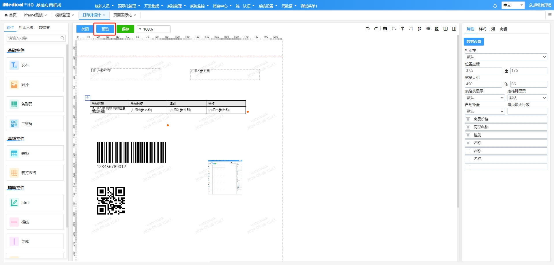 上面的示例代码中首先声明了传入参数paramsData,后面添加方法dealData用来处理后端返回的参数,拼接paramsData的elements和elementsData两个属性,最终调用preview方法预览生成的打印模板,最终预览后的页面如下,其中布局的参数示例中是写的固定参数,使用时可根据数据长度及所需要的样式动态生成参数。