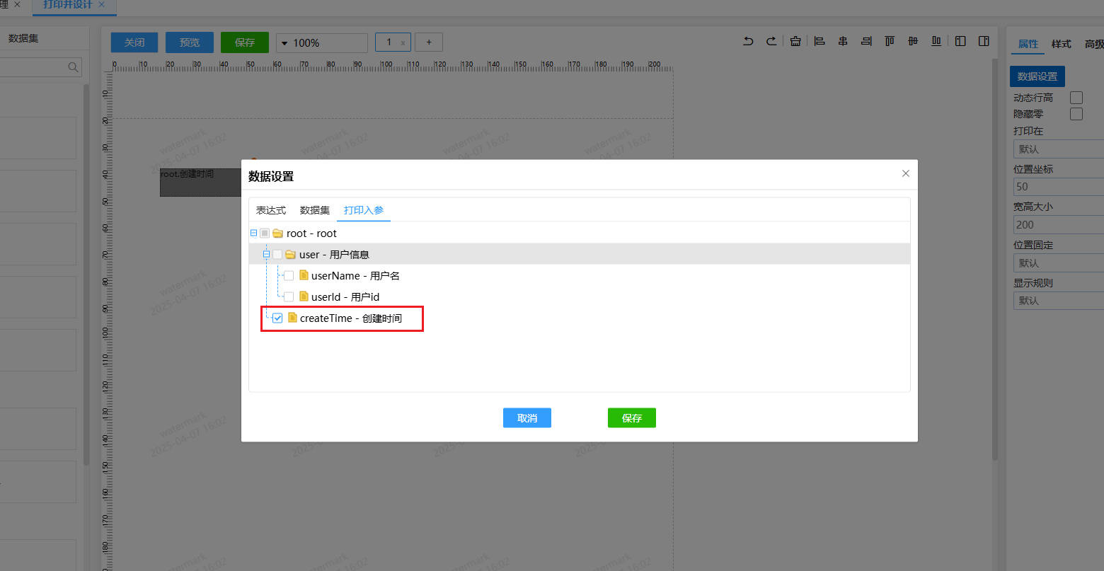 | 映射值 | 将打印过程中前端传入的参数赋值给参数字段。 |