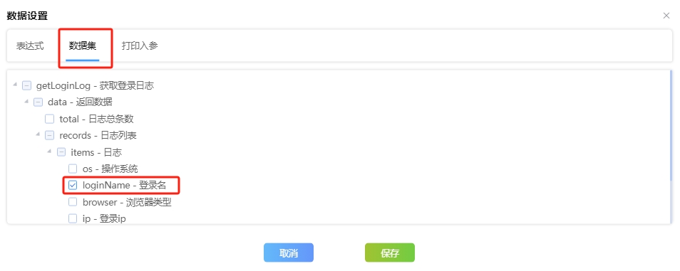第二种设置数据的方式是数据集,选择数据集页签后,页面内会展示设计页面中左侧数据集设置的数据,数据是树状机构的,且使用者只可以选择最底层的节点作为展示的数据。 选中后关闭数据设置弹窗,模板中刚刚设置的文本控件中会展示刚刚选中的数据节点,每一级节点通过.分割展示,当预览或者打印时会获取所设置的数据集的数据展示在打印内容中。