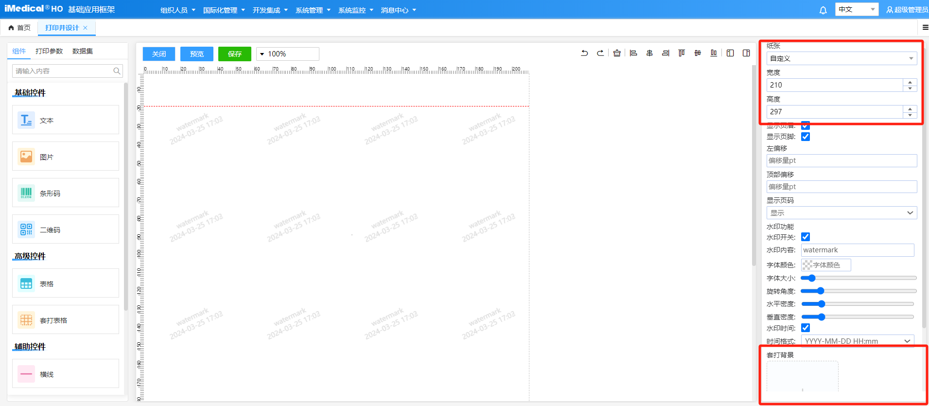 | 纸张 | 配置打印纸张规格,可以自定义,也可以选择通用规格A3、A4、A5等 |
