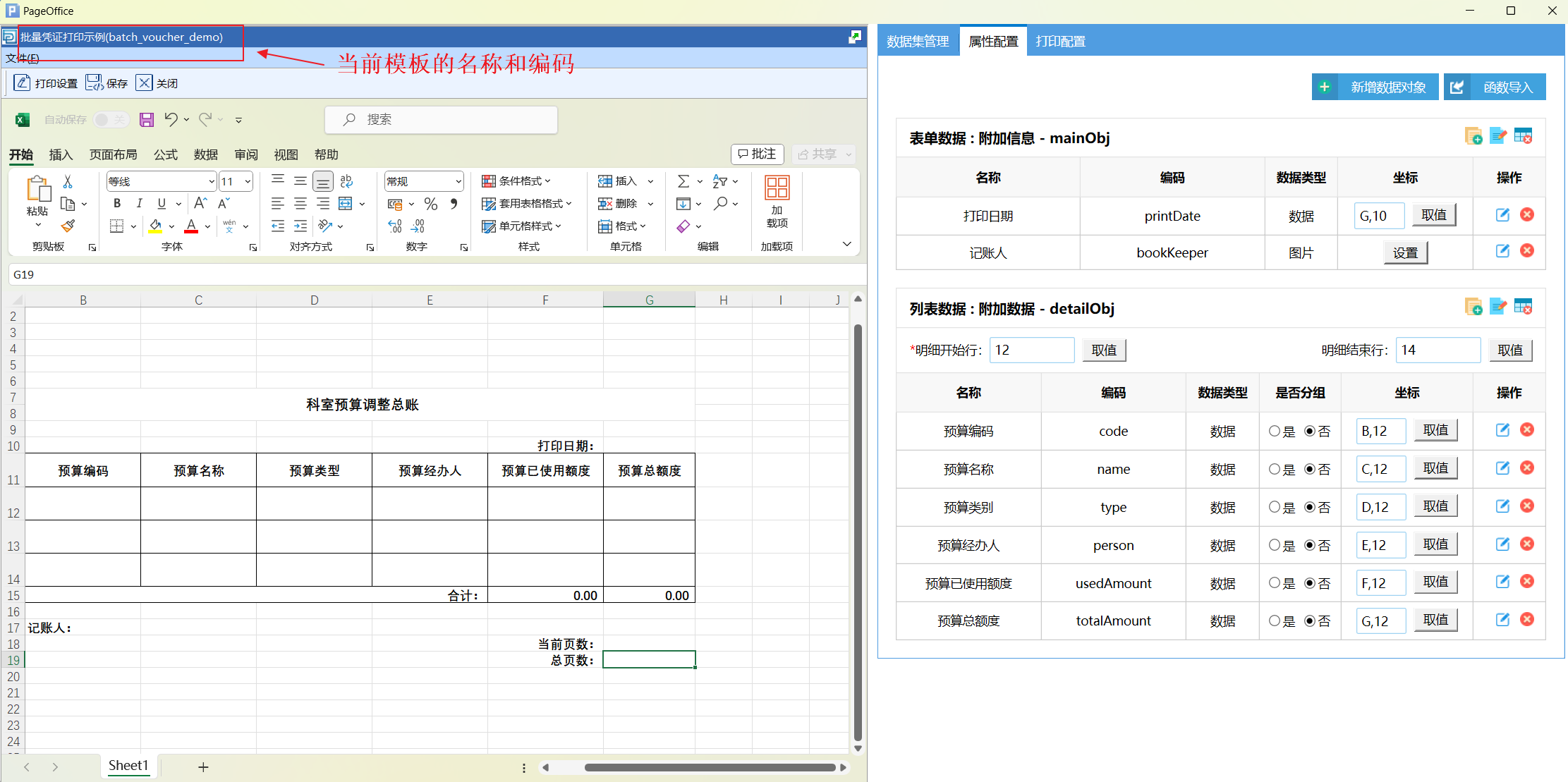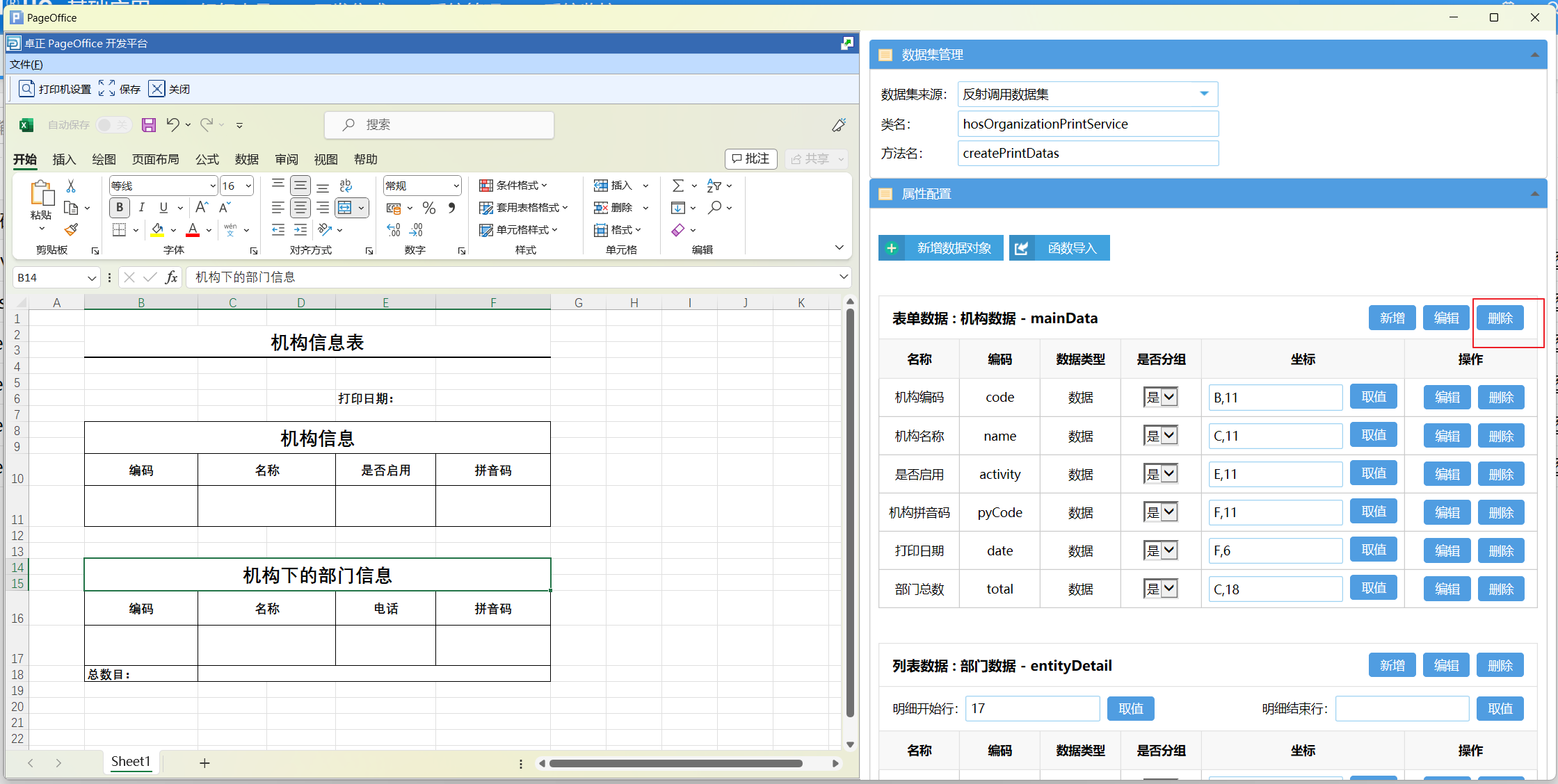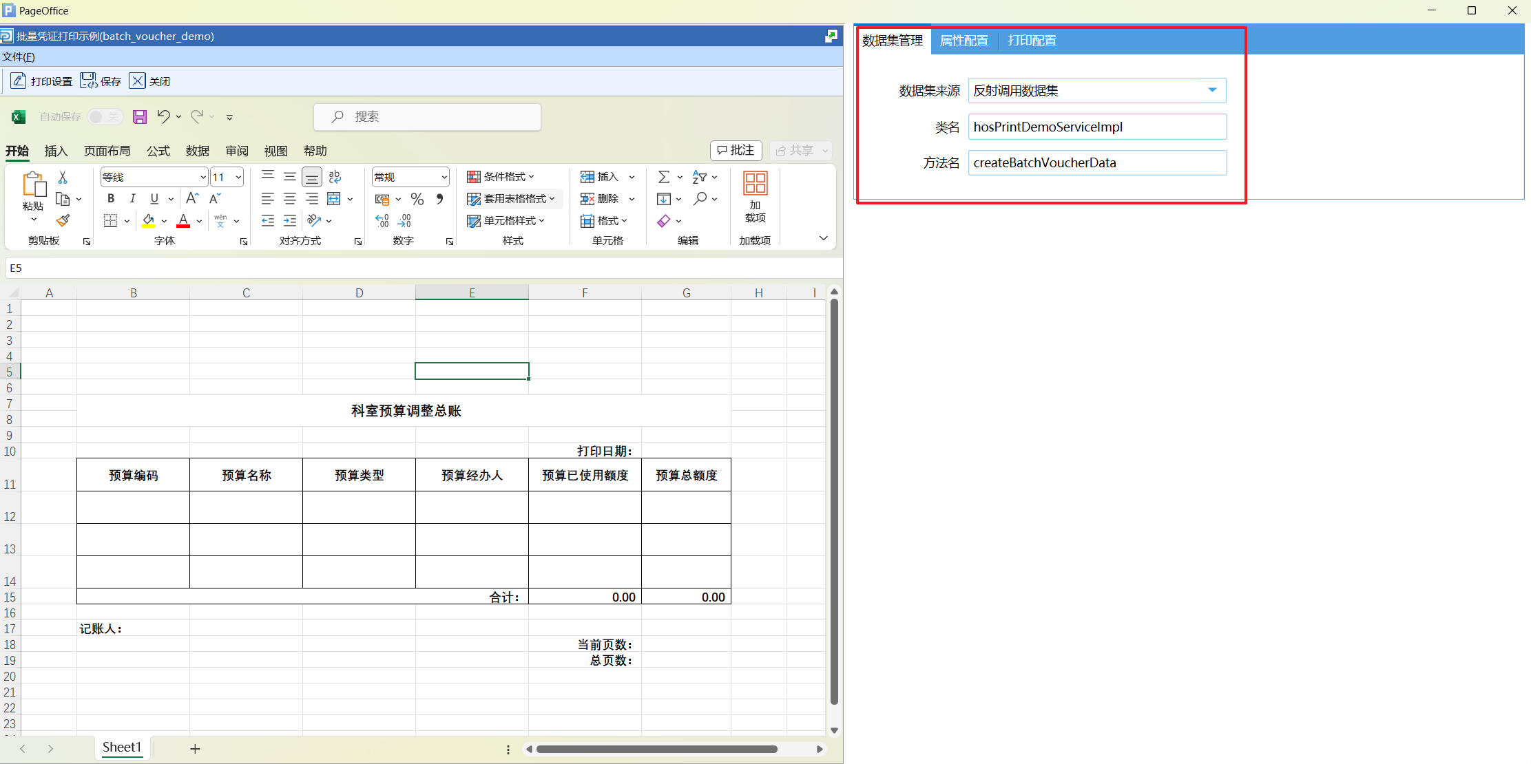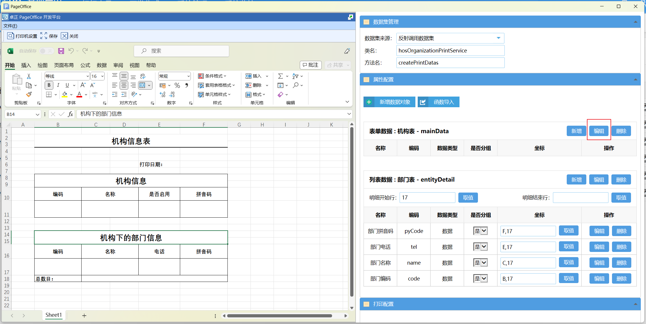打印设计页面分为两个部分,左侧是Excel 设计页面,右侧是模板相关的数据配置页面。数据配置有三个部分,分别为数据集管理、属性配置和打印配置。