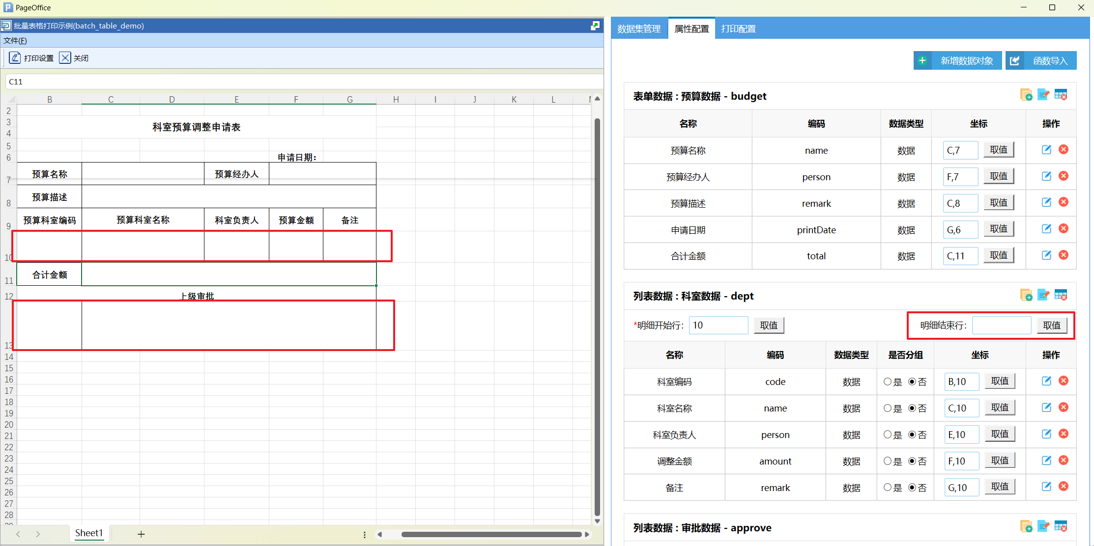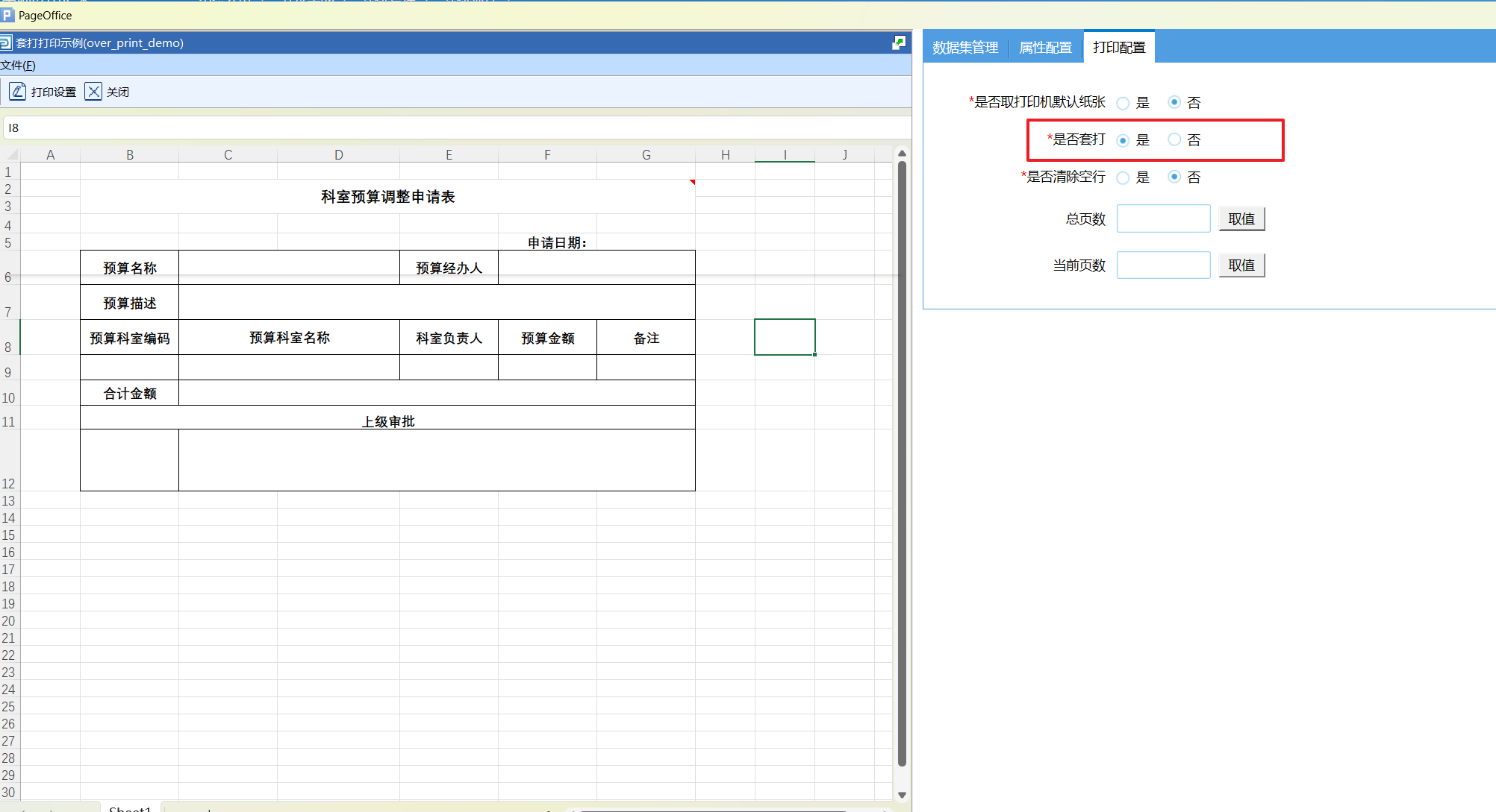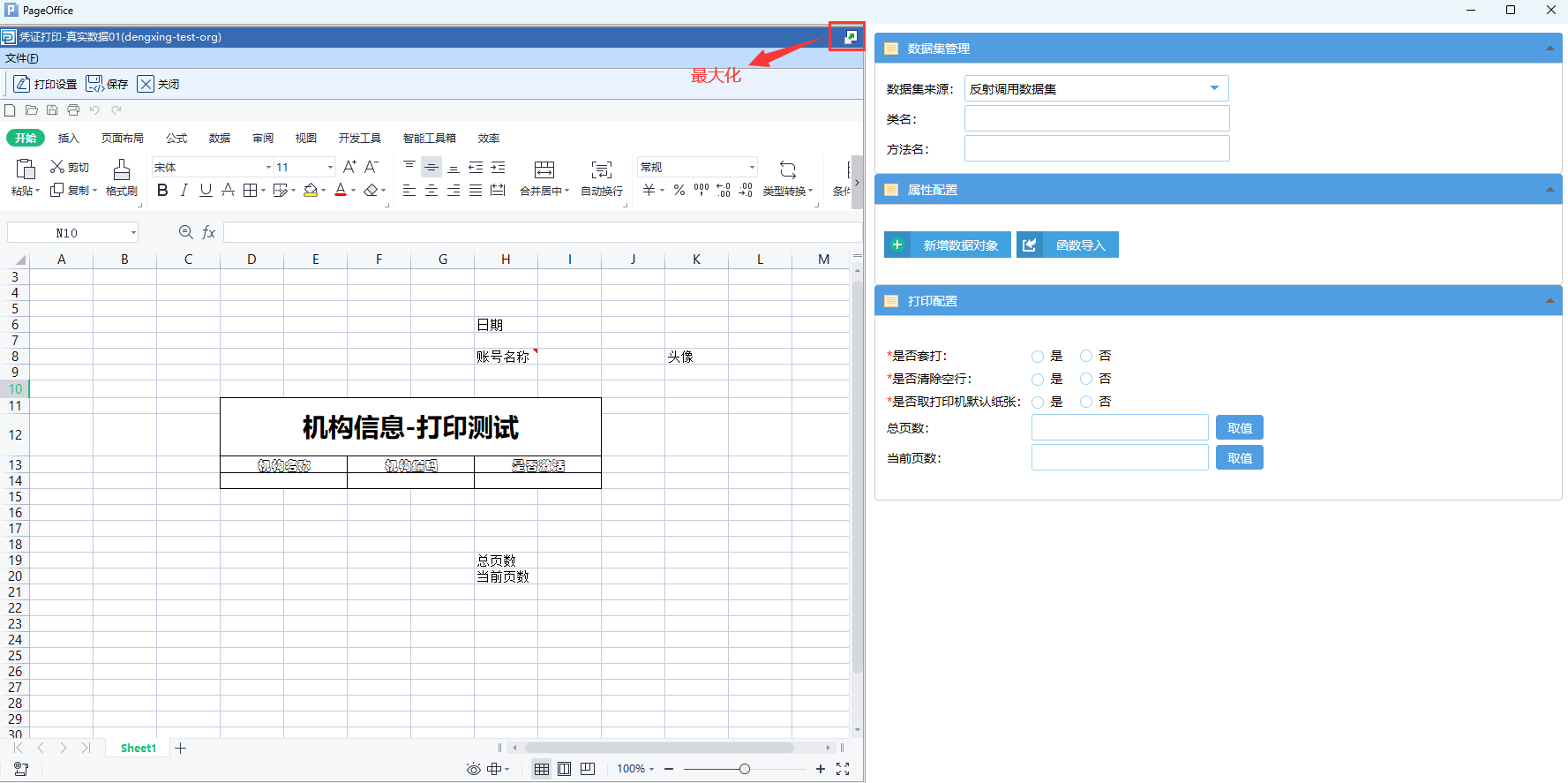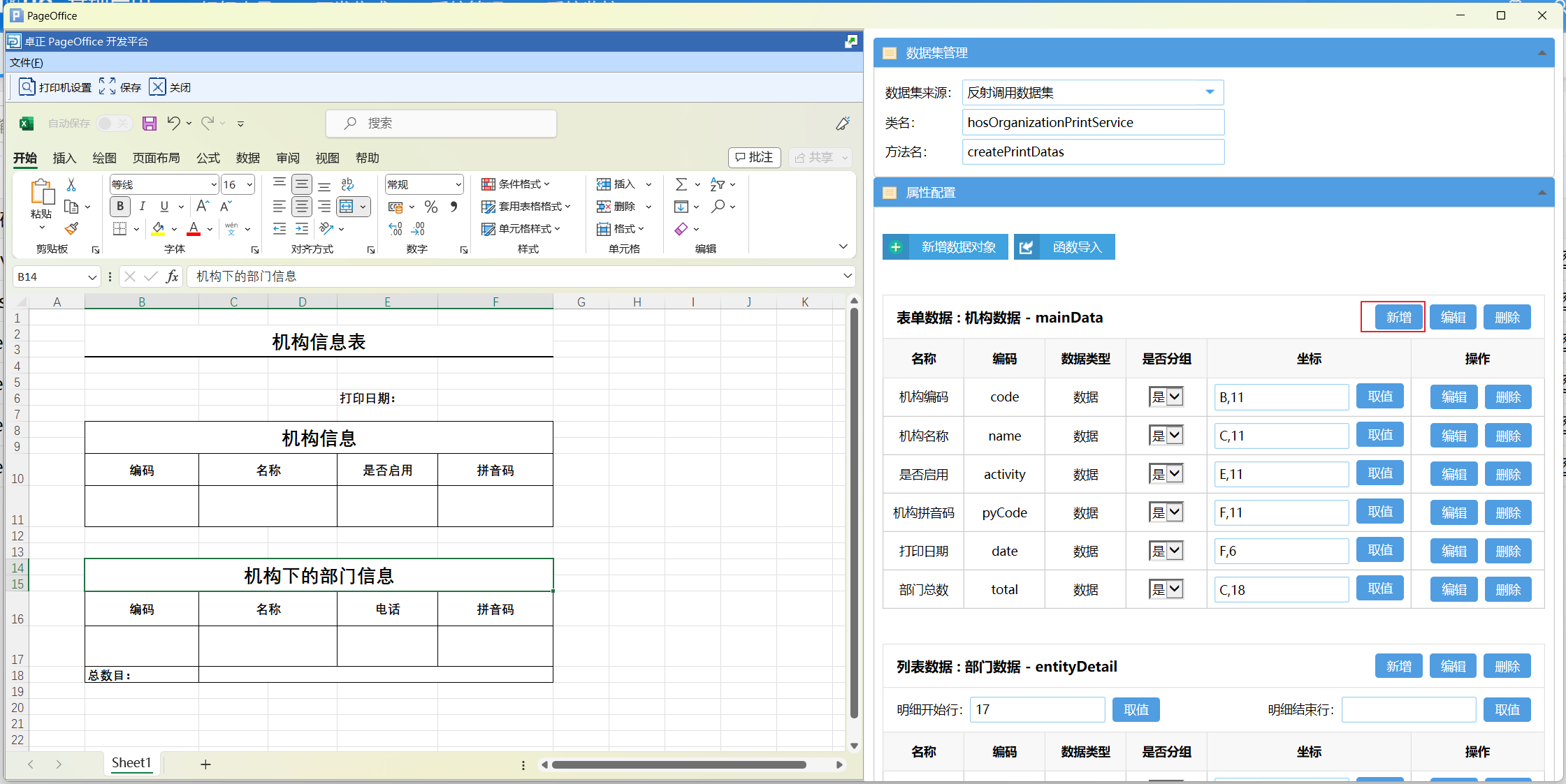 打印设计页面分为两个部分,左侧是Excel 设计页面,右侧是模板相关的数据配置页面。数据配置有三个部分,分别为数据集管理、属性配置和打印配置。