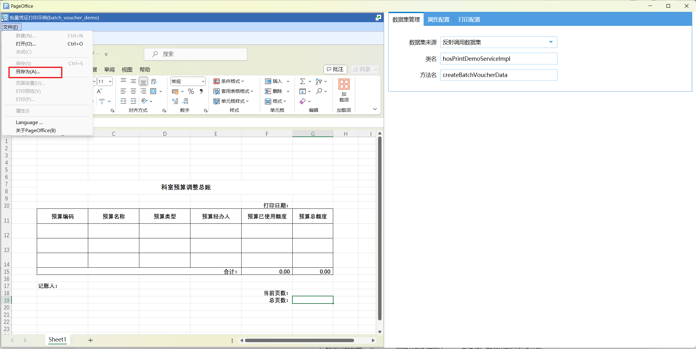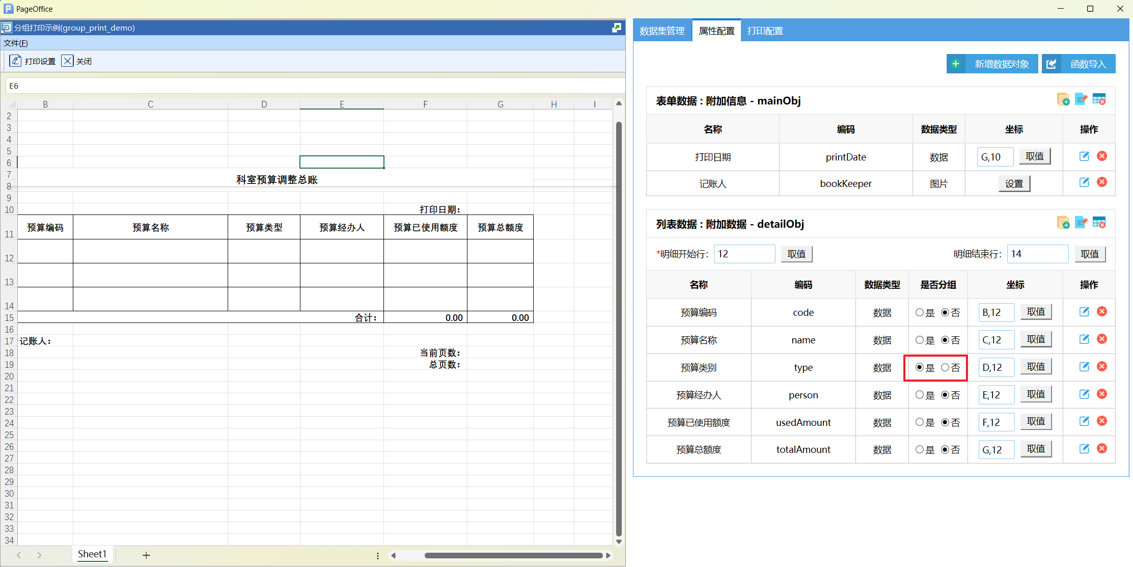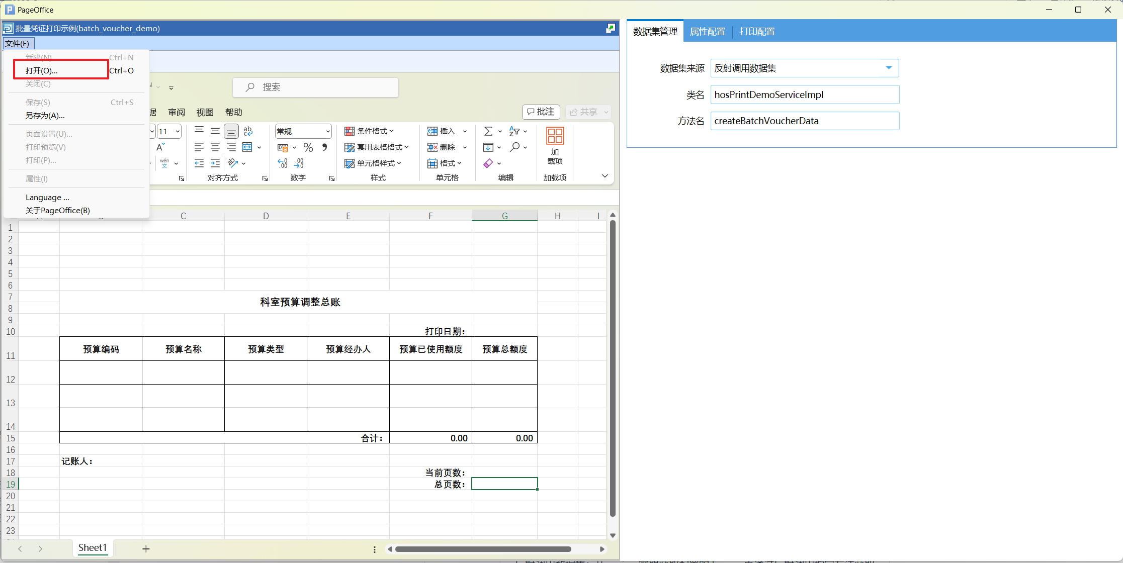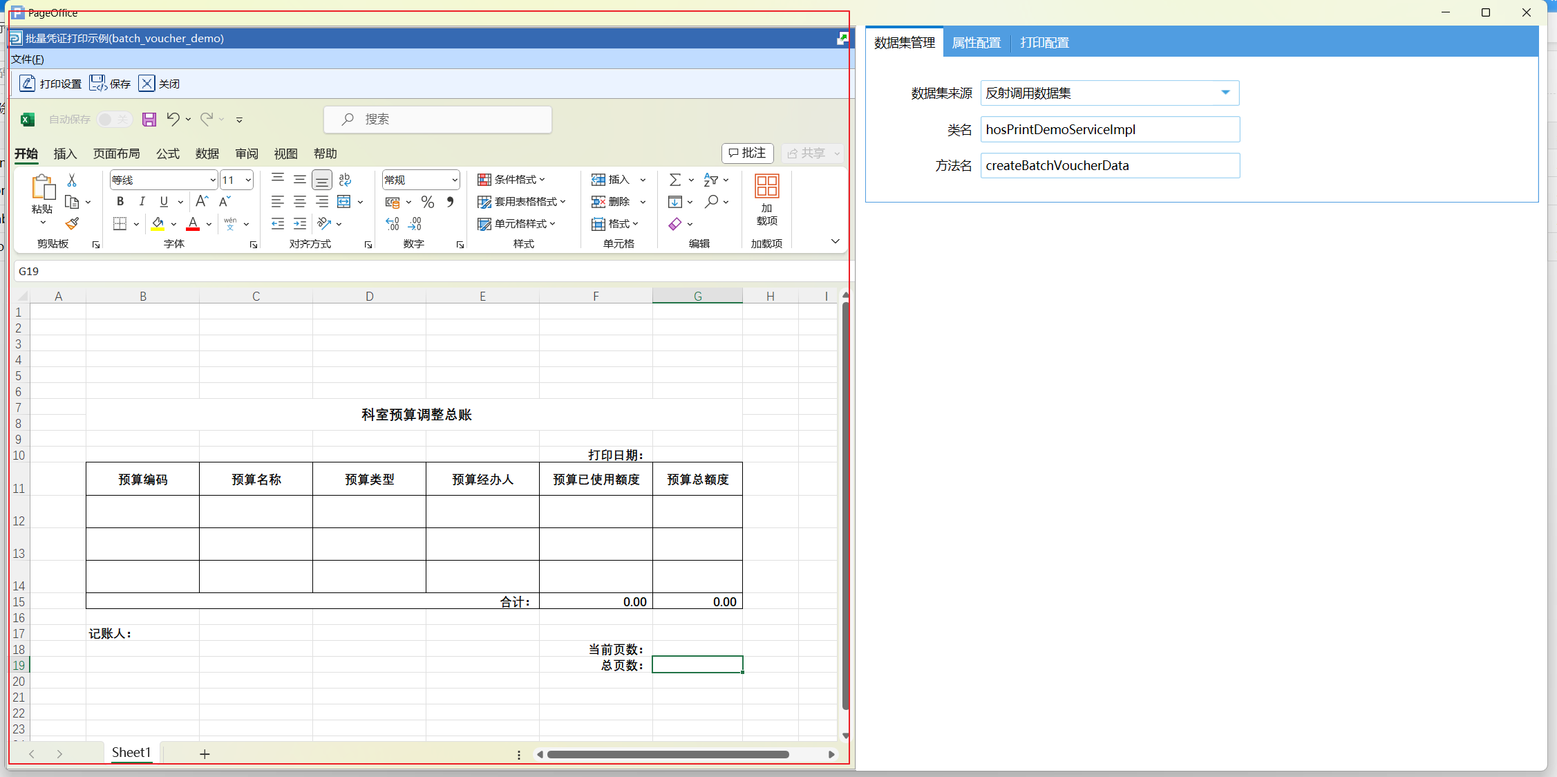 打印设计页面分为两个部分,左侧是Excel 设计页面,右侧是模板相关的数据配置页面。数据配置有三个部分,分别为数据集管理、属性配置和打印配置。