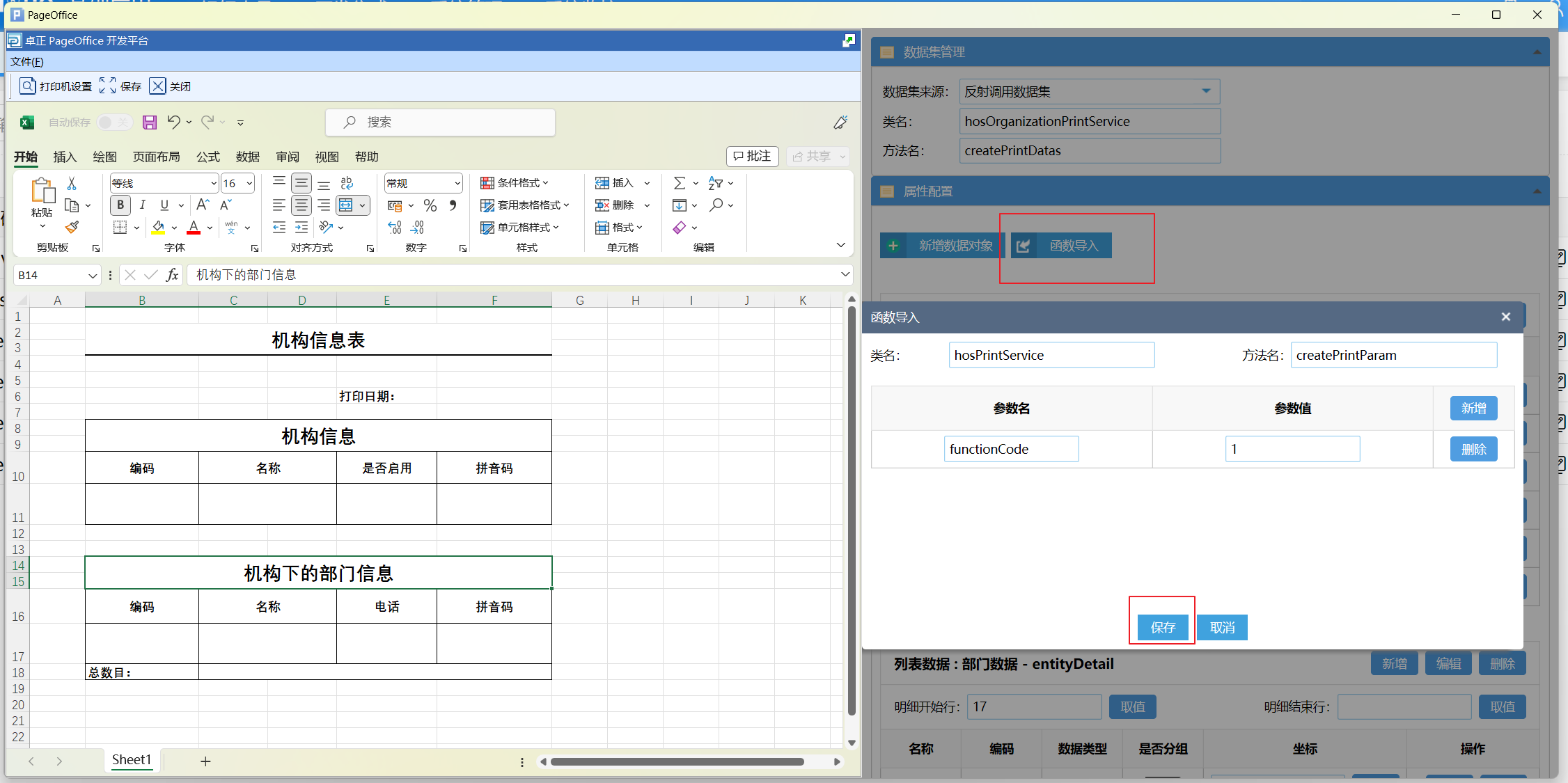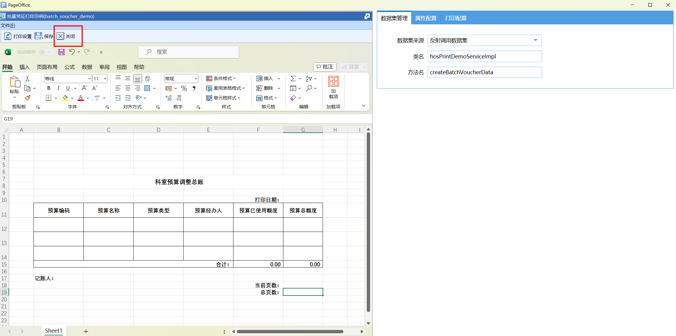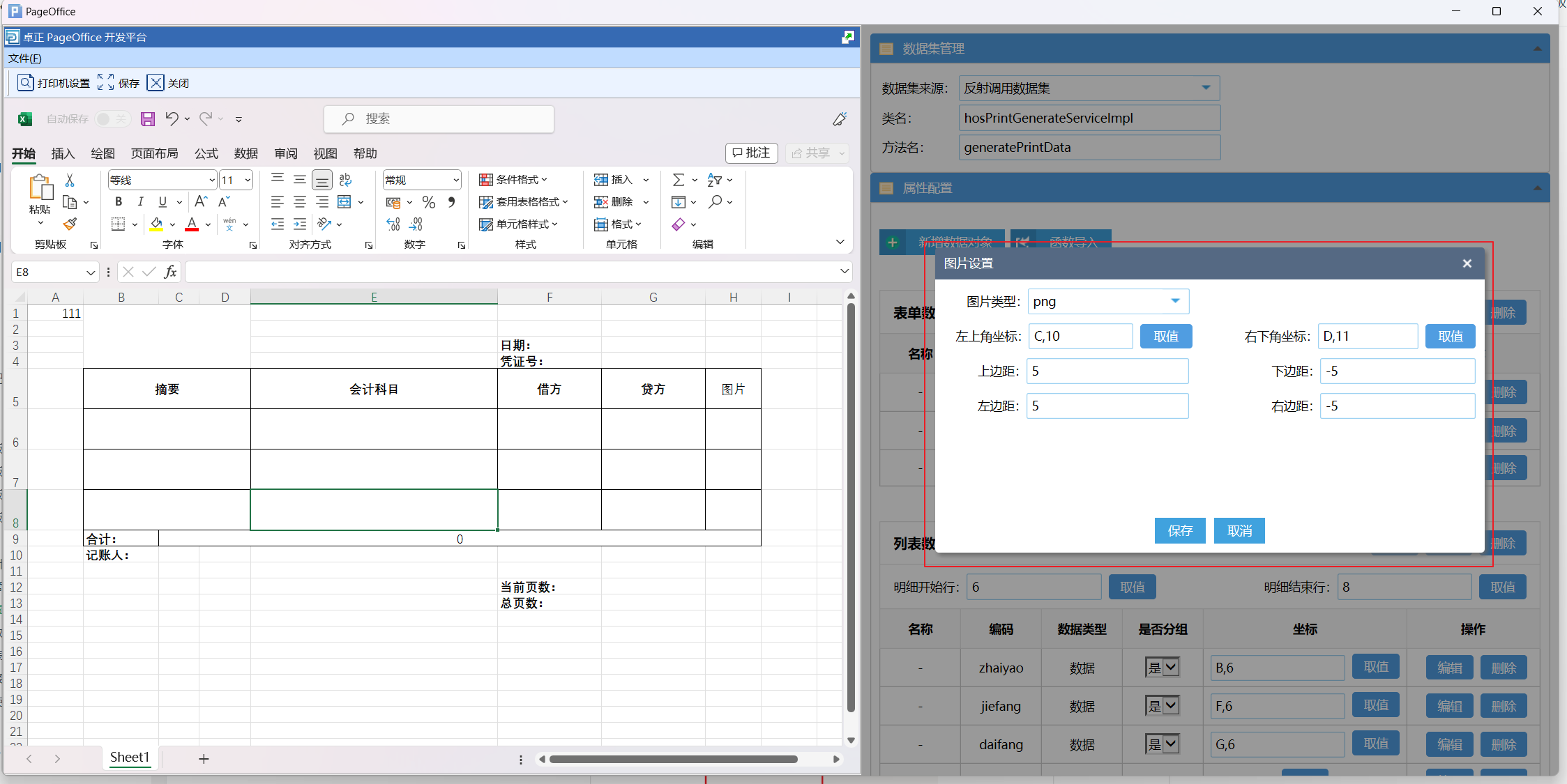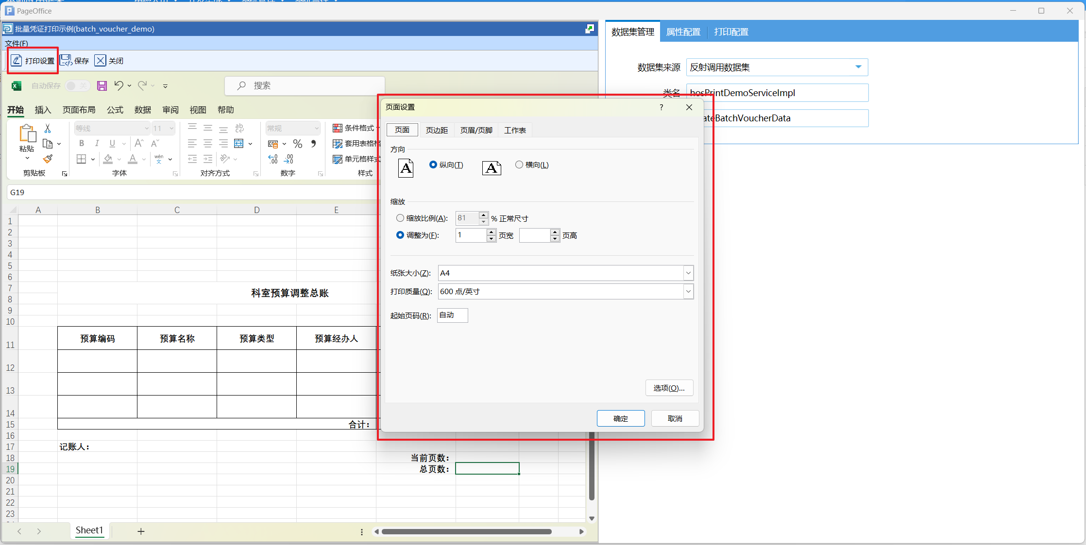 打印设计页面分为两个部分,左侧是Excel 设计页面,右侧是模板相关的数据配置页面。数据配置有三个部分,分别为数据集管理、属性配置和打印配置。