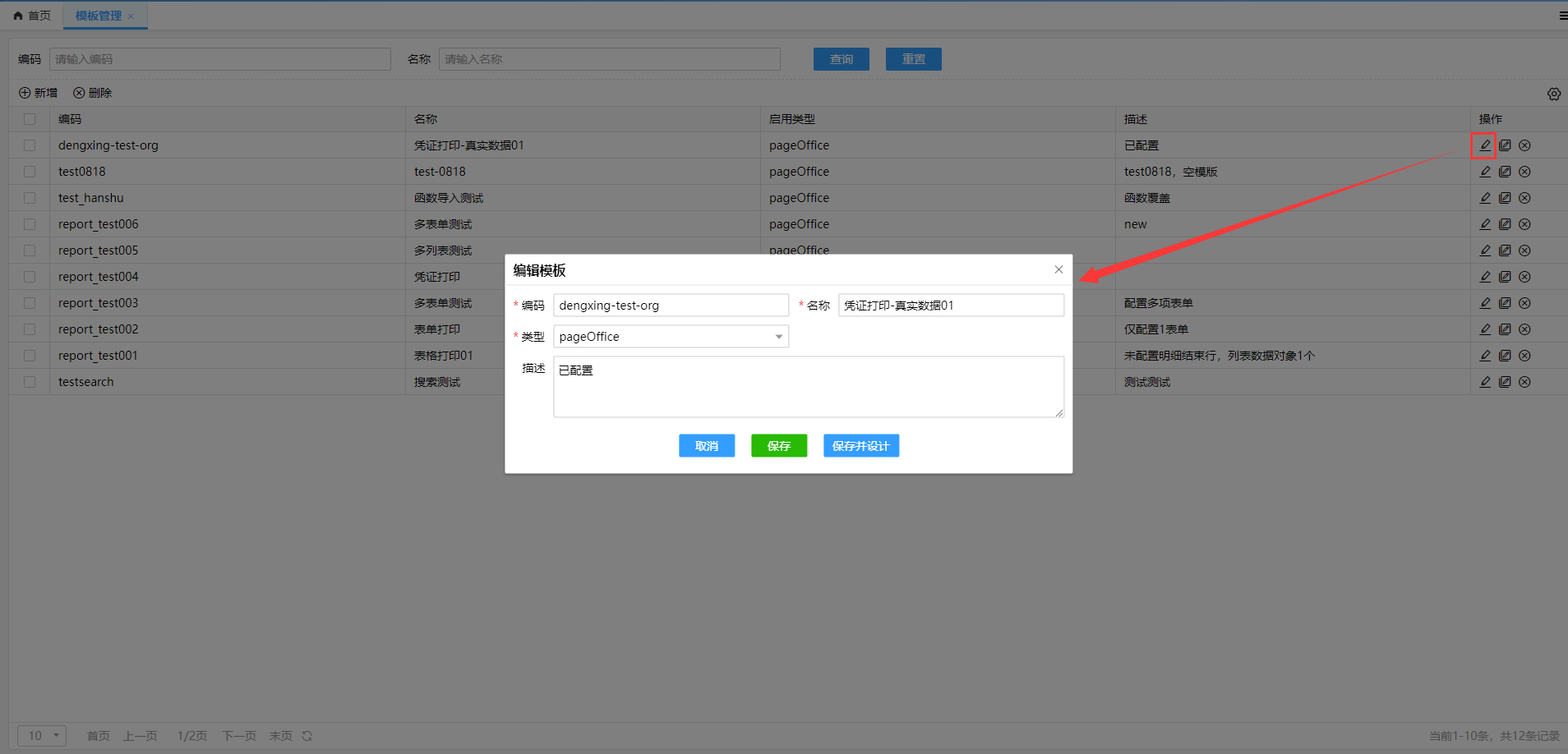 点击需要修改的数据右侧编辑按钮,弹出编辑页面。修改表单内容,点击保存即可。若点击的是保存并设计按钮,则将自动跳转到模板设计页面。