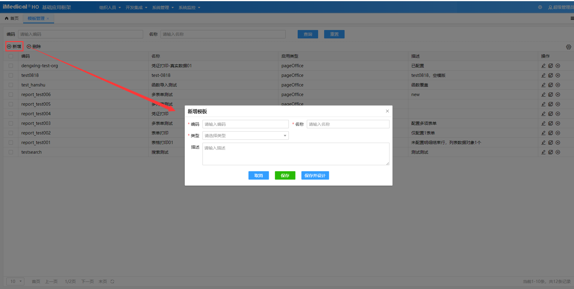 点击新增按钮,弹出新增页面,编辑模板信息后点击保存或保存并设计按钮即可。若点击的是保存并设计按钮,则将自动跳转到模板设计页面。