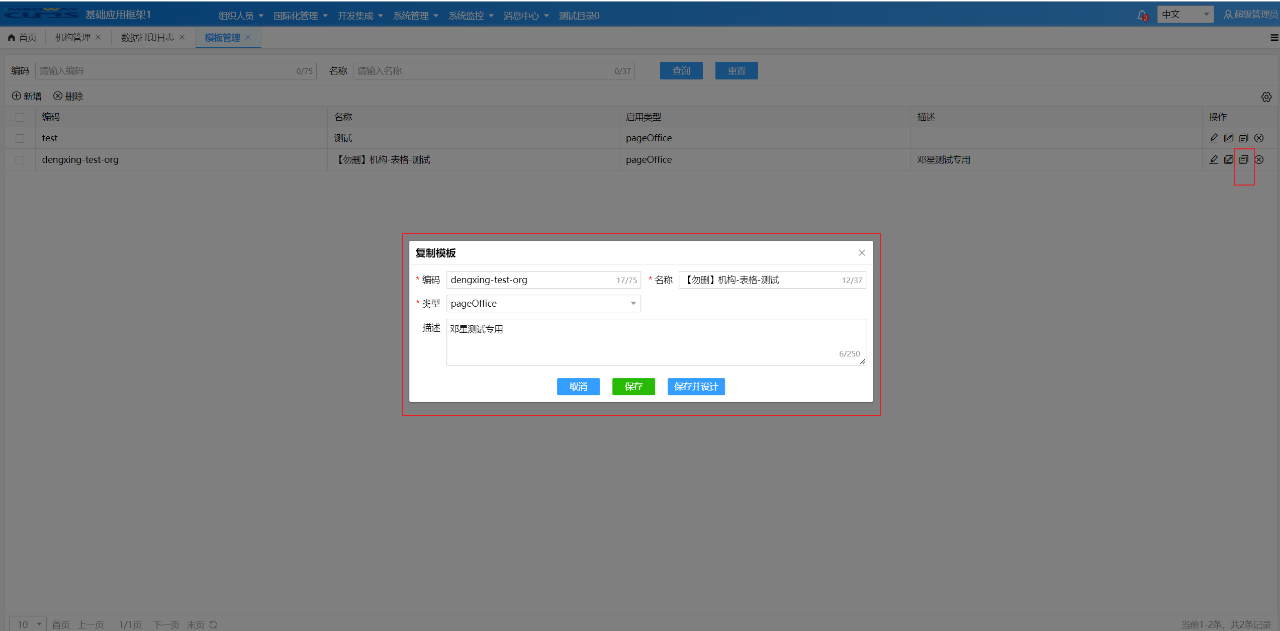 用户若想要复用旧模板的设计和配置,可使用复制模板功能。点击旧模板数据右侧复制按钮,修改模板编码、名称等内容,点击保存,即可保存一个新模板数据。其模板文件和配置都是从旧模板复制而来。